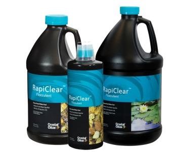 CrystalClear RapiClear is designed to clear cloudy, muddled pond water quickly, unusually within 1 to 3 hours depending on the size of the pond. RapiClear will quickly restore pond water to a brilliant shine. The unique properties allow suspended particles in water to attract together and fall to the bottom of the pond where they can be vacuumed out or removed by filtration for a clean pond fast